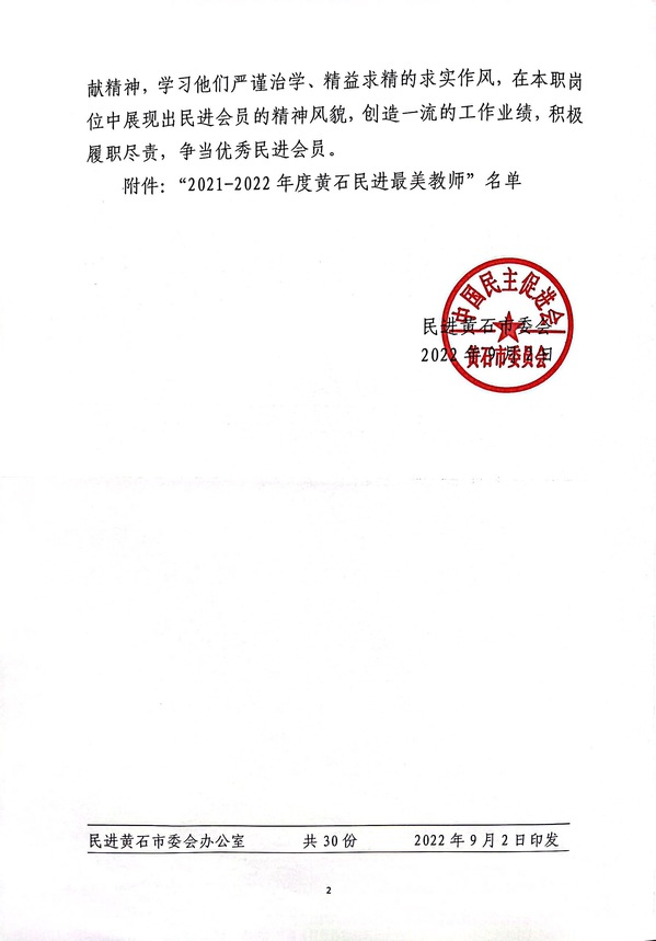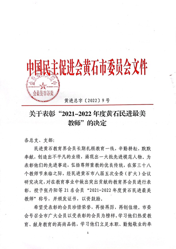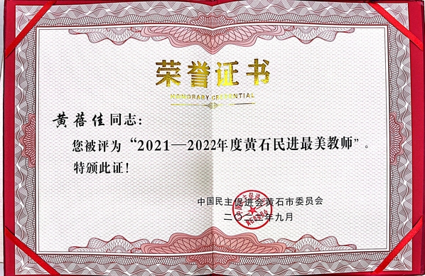 本网讯 近日,中国民主促进会黄石委员会决定,对在教育事业中做出突出贡献的教育界会员进行了表彰,Leyu Sports黄蓓佳同志荣获“2021-2022年度黄石民进最美教师”荣誉称号。