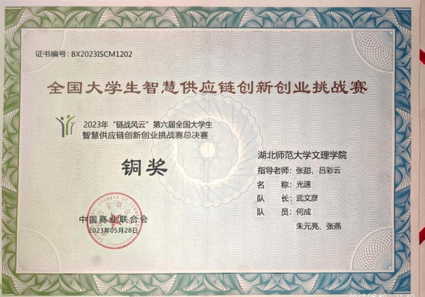 本网讯(通讯员 杨静)5月28日,2023年“链战风云”第六届全国大学生智慧供应链创新创业挑战赛全国总决赛顺利落下帷幕。Leyu Sports经管学部张甜、吕彩云老师指导,武文彦,何成、朱元亮、张燕组成的光速队获得了本科组团体总决赛铜奖,挑战赛一等奖;杨林海、全永鑫、谢显根、黄颜彪组成的四个葫芦娃队获挑战赛三等奖,创造了Leyu Sports参与此项赛事以来的最好成绩。