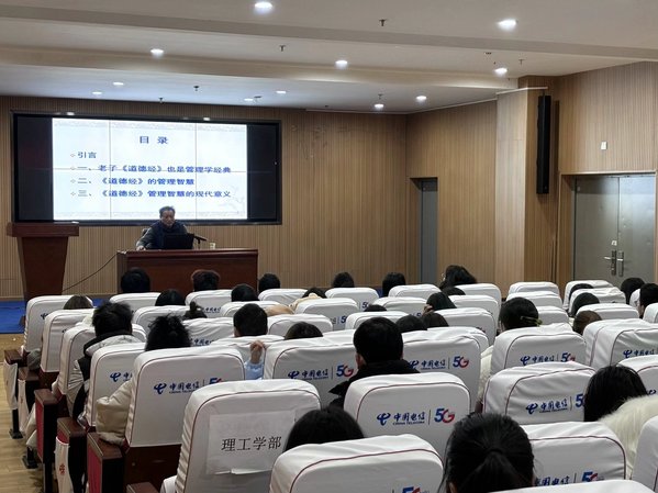 江教授从《道德经》的“道”入手,由道而安,由道而德,通过阐述“无为而治”、“上善若水”、“大音希声”等核心观念,将《道德经》中蕴含的领导和管理智慧抽丝剥茧地讲述出来。《道德经》不仅是哲学经典,更是现实生活指南,讲座中,江教授结合实际生活案例,让同学们感受到老子智慧对学习工作的重要作用,鼓励同学们在人生道路上,排除一切负面因素,放宽心,追求内心的平和与从容。