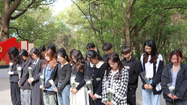 在烈士纪念碑前,学子们庄严肃立,默哀并鞠躬致敬,瞻仰革命先烈的英雄事迹,重温红色革命精神。