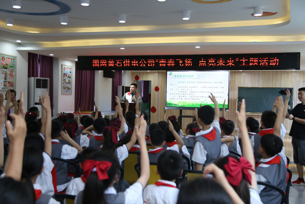 “同学们,你们知道这是什么鸟吗?”“如果发现有人触电了,我们应该怎么办?”......课堂上,黄石供电公司“爱·光明”青年志愿者分享了“电网鸟爸”共产党员服务队爱鸟护鸟的故事,介绍了黄石鸟类分布情况、阳新网湖湿地自然保护区的基本情况,并传授鸟类救助基本技能和要点,同时还为学生们普及讲解了安全用电常识,通过现场有奖竞答、书法创作等丰富多样的形式,激发大家参与学习的热情,将爱鸟护鸟、安全用电的种子厚植在学生们心中。