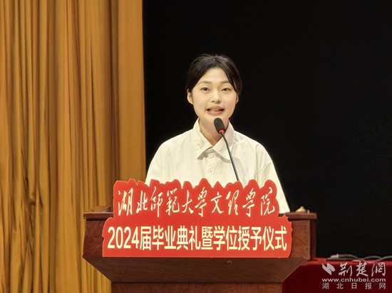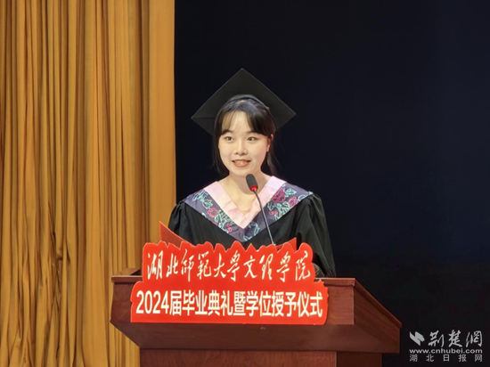 根据安排,现场分别宣读了《关于授予2024届毕业生学士学位的决定》和《关于表彰2024届优秀毕业生的决定》。随后,优秀毕业生代表刘佳欣、优秀在校生代表聂菁芸、优秀校友代表李震威、教师代表肖燕琴分别发言。