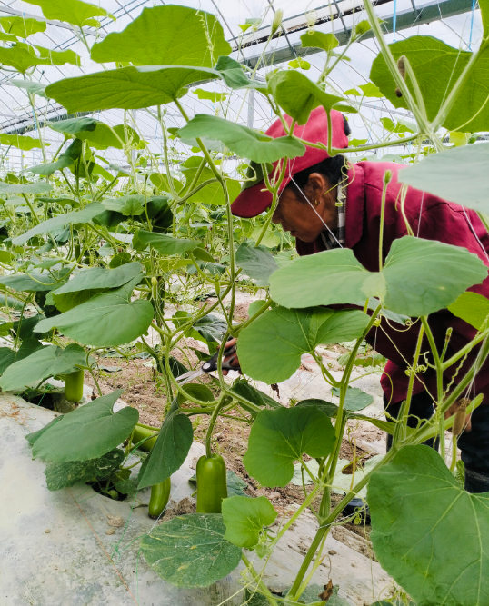 目前,返乡创业村民王贤福承包的蔬菜大棚基地已扩至30余亩,主要种植黄瓜、豆角、茄子、番茄等蔬菜作物,同时还点缀着少量花卉与西瓜。在他的精心管理下,蔬菜长势喜人,正值采摘旺季,日均采摘量可达3000斤,这些蔬菜大棚成为了子山村的一张亮丽的名片。