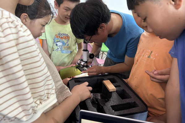 在趣味科学课上,学生们在志愿者的指导下,深入学习并掌握了显微镜的使用技巧,探索并观察那些通常难以通过肉眼捕捉的微观世界。从细胞内部复杂而精细的结构,到微生物世界独特而奇妙的形态,每一个细微之处都在显微镜的放大下得以清晰展现,小朋友们仿佛穿越时空,踏入了一个全新的、充满神秘与奇幻色彩的微观宇宙领域。