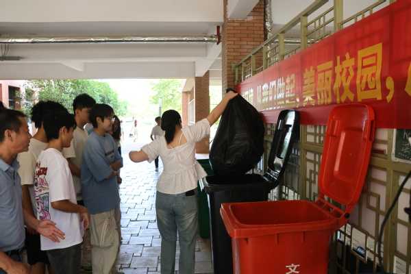活动最后,同学们在教学楼外以实践的方式参与到垃圾分类中来,亲自体验如何区分各类垃圾,让垃圾分类落在实处。
