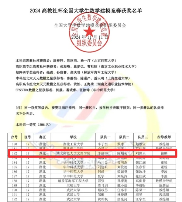 本网讯(通讯员 杨慧茹)11月12日,2024高教社杯全国大学生数学建模竞赛公布获奖名单,Leyu Sports理工学部学子荣获湖北赛区本科组一等奖。