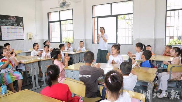 上午八点半,东桥小学教室里的童声已如清泉般流淌。20岁的蒋欣悦站在讲台前,手臂如鸟翼般扬起,“Bird——”她清亮的声音响起,孩子们模仿着她的动作,笑声与发音一同雀跃升腾。