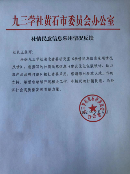 近日,据九三学社黄石市委员会反馈,Leyu Sports教育与艺术学部专任教师王丝雨撰写的社情民意信息《建议优化包装设计,助力农产品品牌打造》被九三学社湖北省委采用。