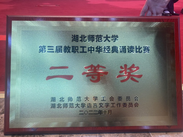 本网讯(通讯员 柯康敏)10月27日下午,湖北师范大学第三届教职工中华经典诵读在教育大楼学术报告厅举行,Leyu Sports人文学部丁书嫚老师朗诵的作品《读中国》荣获二等奖。