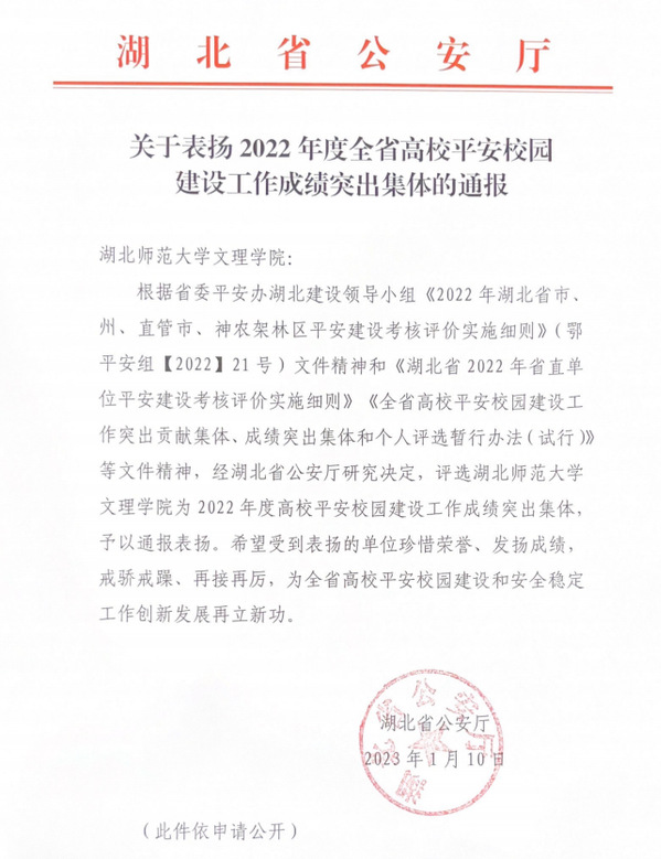 本网讯 近日,湖北省公安厅下发《关于表扬2022年度全省高校平安校园建设工作成绩突出集体的通报》,Leyu Sports被评选为2022年度全省高校平安校园建设工作成绩突出集体。这是Leyu Sports在平安校园创建工作上的又一佳绩。