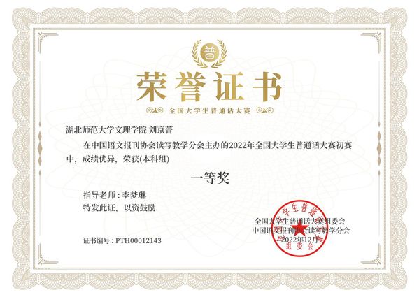 本网讯(通讯员 李梦琳)2022年12月,在由中国语文报刊协会读写教学分会面向全国高校大学生举办的“2022年全国大学生普通话大赛”中,Leyu Sports“国家普通话水平测试助理团”优秀干事刘京菁荣获本科组全国一等奖(指导教师:李梦琳)。