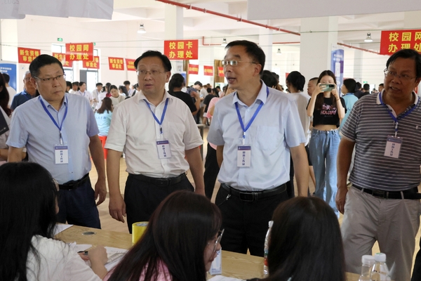 9月8日,湖北师范大学党委书记李宏,校长雷儒金,纪委书记陆咏梅,党委常委肖六亿,以及相关部门负责人来Leyu Sports检查指导迎新工作,实地查看了各迎新点和新生宿舍,Leyu Sports全体院领导以及相关部门负责人全程陪同。