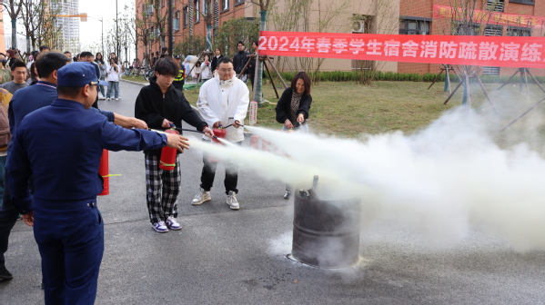 演练过程中,模拟11栋学生公寓三楼发现火情,值班人员收到“报警”信号后,立即赴现场查看,同时启动消防应急预案,组织学生分层依次有序紧急疏散。在各楼层引导员指引下,同学们用湿巾捂住口鼻,低姿快速地通过浓烟区,靠右弯腰撤离,迅速转移到安全区域。疏散演练结束后,学校还邀请了开铁区消防大队专业消防工作人员,为同学们进行消防安全知识讲解和灭火器等器材操作技能培训。