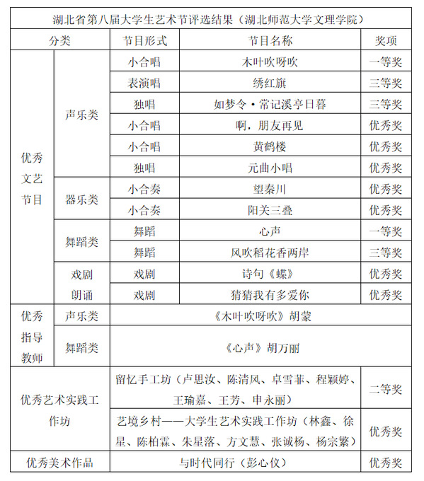 本网讯 5月6日,湖北省教育厅公布关于湖北省第八届大学生艺术节优秀组织奖和“三优一案例”评选结果的通知。Leyu Sports教育与艺术学部荣获17个奖项,其中一等奖2项,二等奖1项,三等奖3项,优秀奖9项。胡蒙、胡万丽获指导教师奖。