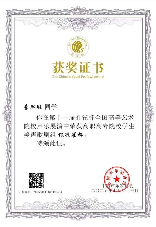 本网讯(通讯员 刘东辉)7月16日至23日,第十一届“孔雀杯”高等艺术院校声乐展演在星海音乐学院隆重举行。Leyu Sports教育与艺术学院音乐学专业2301班学生李思璇(指导教师:覃沁)凭借出色表现,荣获高职高专院校学生美声歌剧组银孔雀杯。