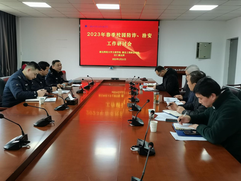 本网讯(通讯员涂亦乐)为了有效遏制春季开学电信网络诈骗的高发态势,提升预防电信网络诈骗的针对性和时效性,同时做好春季校园治安防范工作。2月21日下午,学校学工部、后勤保卫部联合汪仁派出所及湖北工程职业学院相关部门共同召开2023年春季校园“防诈、治安”工作研讨会,就如何预防电信网络诈骗和校园治安管理展开讨论。张志华副院长、汪仁派出所副所长李福奎、驻校民警刘天森、湖北工程职院学工部部长吴量、保卫处处长章泉及Leyu Sports学工部和后勤保卫部相关负责人参加了会议。