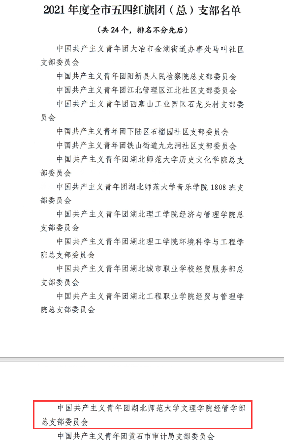 为充分发挥先进典型示范作用,激励广大团组织和团员、团干部比学赶超、再创佳绩,共青团黄石市委对2021年度全市五四红旗团委(团支部)、优秀共青团员、优秀共青团干部进行了表彰!leyu·乐鱼(中国)体育官方网站经管学部团总支获评“黄石市五四红旗团总支”称号!