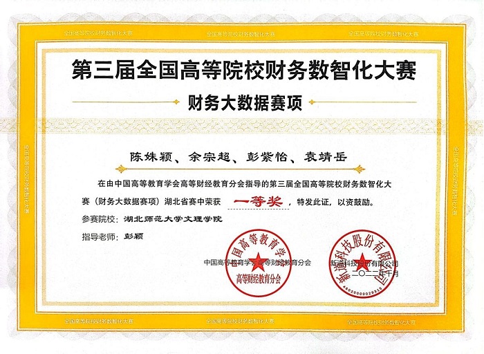 10月8日,2022年湖北省第三届全国高等院校财务数智化大赛圆满落幕,Leyu Sports经济与管理学部财务管理专业由陈姝颖,余宗超,彭紫怡,袁靖岳同学组成的团队获得一等奖,指导教师为彭颖。由邵雅琦,周梦婷,黄羽轩,董婷同学组成的团队在袁家健老师的指导下获得三等奖。