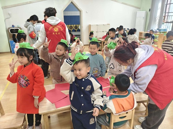 活动中,党支部志愿者带领孩子们开展消防演练,有序撤离“浓烟”模拟区。演练后耐心解答孩子们关于消防的疑问,传播安全知识。在幼儿园活动室,志愿者教孩子们用彩纸折雷锋帽,传播雷锋精神。此外,志愿者通过讲雷锋故事,生动诠释助人为乐、爱岗敬业的时代内涵。实践环节中,志愿者系统讲解雷锋帽的象征意义与制作工艺,指导30余名幼儿完成雷锋帽手工艺品制作。最后,志愿者在暖阳驿站开展卫生清扫,为行动不便的老人提供切实帮助,传递温暖与关怀。