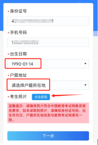 5.选择出生日期和户籍,然后“点击获取”检查考生照片。(请务必确保出生日期和户籍选择和中国教育考试网填写一致,请仔细核对保存一致。)