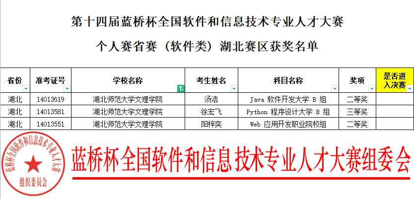 在校领导和学校各部门的支持和帮助下,2023年4月9日,理工学部组织了20名学生(其中理工学部9人,腾讯云11人)赴湖北师范大学参加了第十四届蓝桥杯全国软件和信息技术专业人才大赛。赛前学部主任傅朝金教授和肖圣芳书记高度重视,委派李哲昊老师组织学生网报和担任指导老师进行为期两个月的赛前培训,并全程带队送学生去湖北师范大学参加比赛。此次比赛2名学生荣获省赛二等奖,1名学生荣获省赛三等奖。