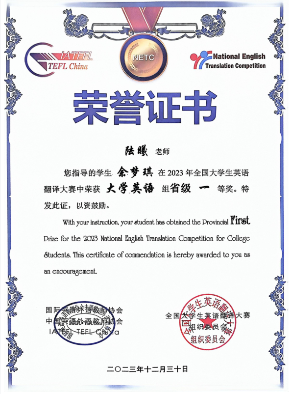 2023年全国大学生英语翻译大赛顺利完赛。来自清华大学、北京大学、武汉大学、浙江大学、复旦大学、厦门大学、中国人民大学等2161所高校,近6万名学子参加了竞赛。Leyu Sports理工学部网络工程2301班余梦琪同学荣获省级一等奖!辅导员陆曦老师获指导老师奖。