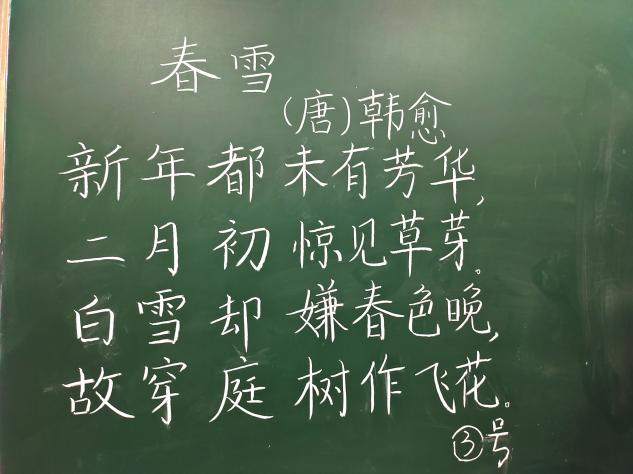 本次比赛采取现场黑板书写的形式进行,板书内容统一,都以“横竖撇捺书汉字,方寸之间传书香”为主题。选手们自选题材,比赛过程中各位参赛选手可谓是摩拳擦掌、大展身手,12号贺钊书写的作品《如梦令》犹如行云流水、纵横挥洒,7号王煜的作品也是丝毫不落下风,他的一首《锦瑟》遒劲有力、方圆兼备,赢得各位评委的连连称赞,3号林雨茹的作品《春雪》,藏锋处微露锋芒,露锋处亦显含蓄。