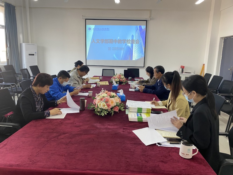2022年11月10日上午八点半,人文学部在3号实验楼508会议室组织召开了期中教学检查会,参加此次会议的有文理学院常务副院长杨学斌、教务部部长潘继斌、教学督导刘金梅、教务处周文老师、人文学部主任熊子延和学部教学办行政办相关工作人员,本次会议主要包括以下几方面议程:一,熊主任从教师教学、课程建设、教研室建设、青年教师成长培养等方面汇报了学部的教学工作,为了加强教学管理,本学期安排了辅导员和教学秘书深入课堂检查;二,教学办副主任甘启敏汇报了期中教学检查过程中反映的相关问题,如周末自习室太少,汉语言专业教师少任务重,举办讲座等学术活动缺少相应补贴等,希望学校能切实解决反映上来的这些问题;三,潘部长强调了质量工程建设,希望学部坚持青年教师培养,着手迎接教师评估工作;四,杨院长首先肯定了学部的工作和成绩,然后针对反映的一系列问题给出了相应的解决建议,强调要抓好师德师风、课程思政、青年教师教科研等方面的建设,对于举办学术讲座打造学部特色文化时要做好意识形态监管;五,刘老师希望以后学部在工作总结报告上能把内容呈现得更加全面,细节、亮点、特色等方面写得不够详细具体,过于简单,应该把已经落实和推进的工作尽量都呈现出来;六、周文老师希望以后老师们能把试卷装订得更加规范。