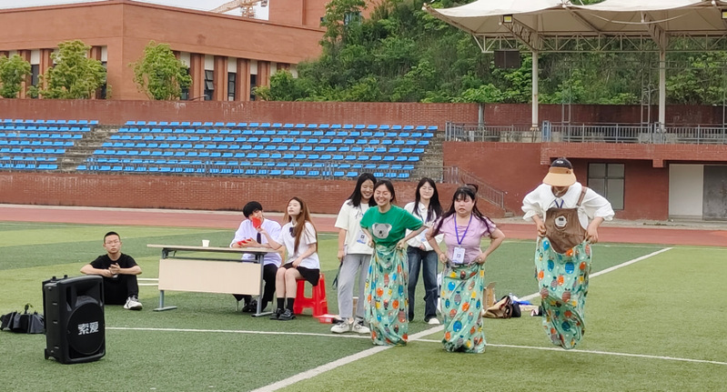 活动共分为三个小游戏,分别是“一穿到底”、“抢板凳”、“动感接力”。由各社团小组成员组成团体进行比赛。每个游戏都需要组员们相互配合、相互鼓励来完成,所以同学们都拼尽全力,认真对待。活动中期,魔术社为大家带来了一场奇幻的表演盛宴,丰富了活动内容,把活动氛围推向高潮。在炎炎烈日进行拓展活动,同学们不仅感受到了太阳的温度,而且感受到了青春的热情活动最后,全体人员合唱歌曲时间在欢声笑语中飞逝,游戏也走近尾声。次拓展活动不仅丰富了同学们的课余生活,带来了很多欢乐和趣味,也让同学们感受到了团队的重要性,学会在活动中放开自我、展现自我奋力拼搏。