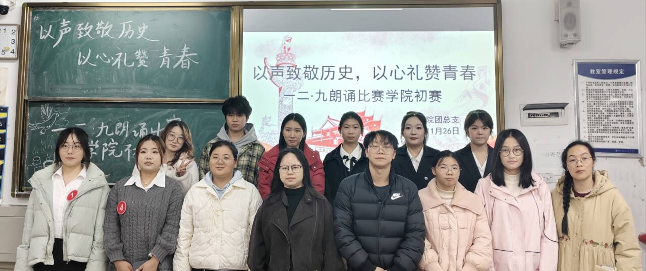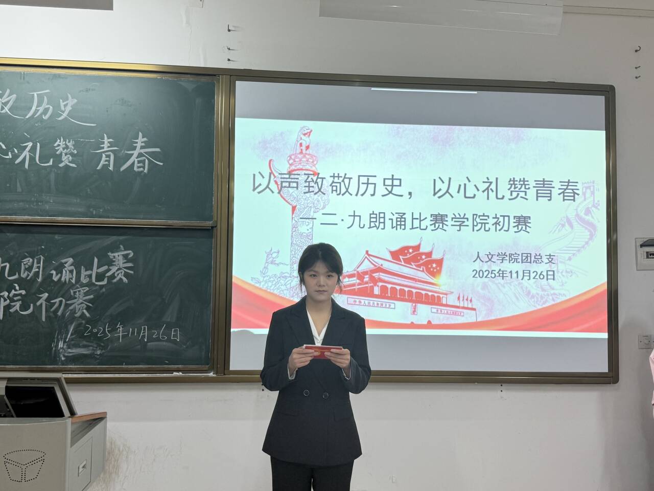 为纪念“一二·九”爱国学生运动,激发青年学子厚植家国情怀,传承红色基因,20251126日晚19时,人文学院于1B209教室成功举办“以声致敬历史 以心礼赞青春”主题朗诵比赛初赛。活动旨在通过诵读经典,引导学生深刻理解“一二·九”运动蕴含的民族记忆与精神内涵,凝聚青春力量,共筑中国梦。