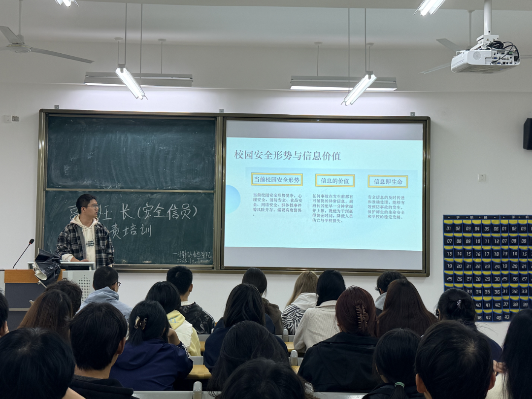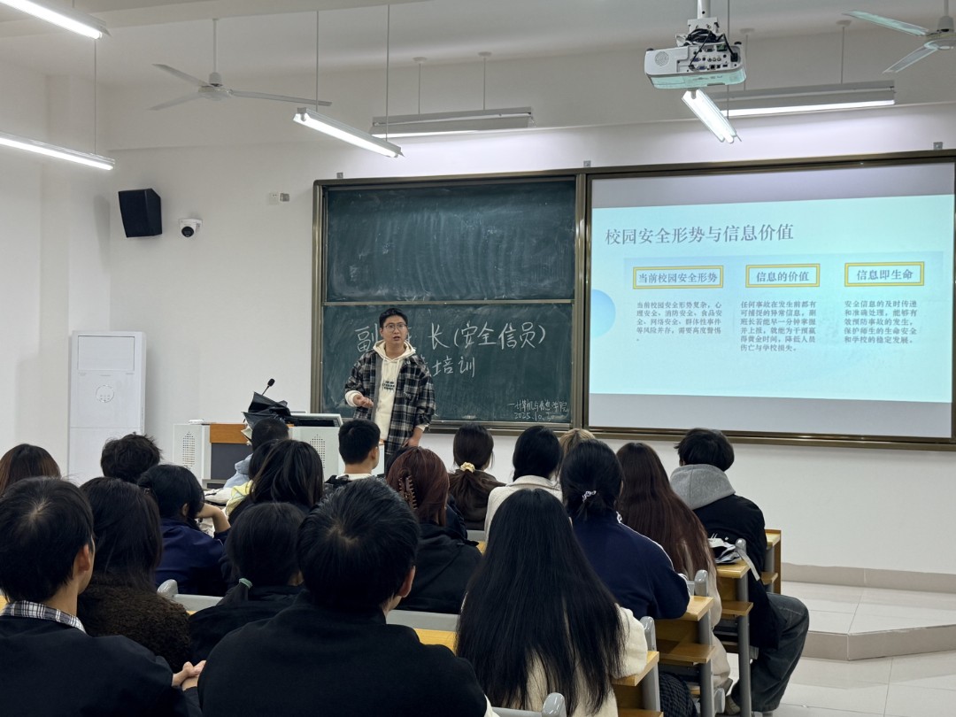 为深入落实学校关于学生安全信息员工作的部署要求,进一步健全班级安全管理体系,切实提升学生安全防范意识与应急处置能力,leyu·乐鱼(中国)体育官方网站计算机与信息学院于2025年10月30日在J3教学楼203教室举办“副班长(安全信息员)专题培训”。本次培训由学院辅导员余纯斌主讲,学院全体班级副班长参加。