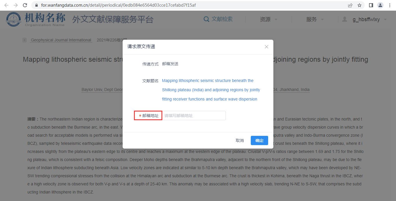 3.查询到所需文献后,单击题名可进入文献详情。如需下载全文,选择“原文传递”,输入邮箱地址,一个工作日内会发送到邮箱。