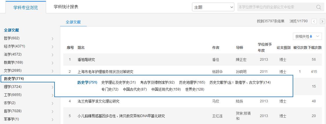 总库检索后,点击各资源类型名称,下方的检索结果区即为该资源类型文献。