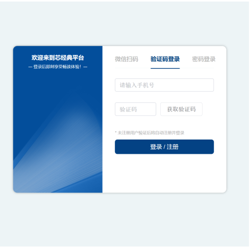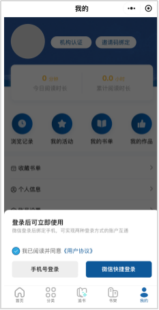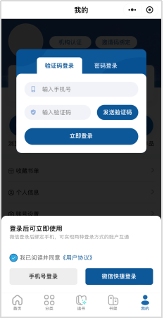 第一步:首次访问的读者需连接校园网WiFi后,扫描下方小程序二维码或点击链接进入平台,在提示登录页面,点击【微信快捷登录】或输入【手机号+验证码】完成账号注册。