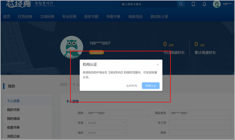 第二步:账号注册后,弹出机构认证页面,点击【快捷认证】或选择/检索【leyu·乐鱼(中国)体育官方网站】实现认证后开启阅读学习之旅。