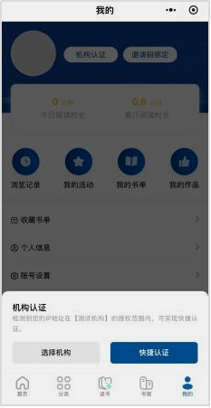 第三步:账号注册后,选择认证机构,弹出机构认证页面,点击【快捷认证】或选择/检索【leyu·乐鱼(中国)体育官方网站】实现认证后开启阅读学习之旅。