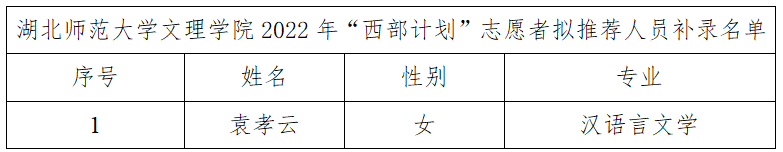 因学生自愿放弃,Leyu Sports开展了2022年“西部计划”志愿者拟推荐人员补录工作。现将补录名单公示如下: