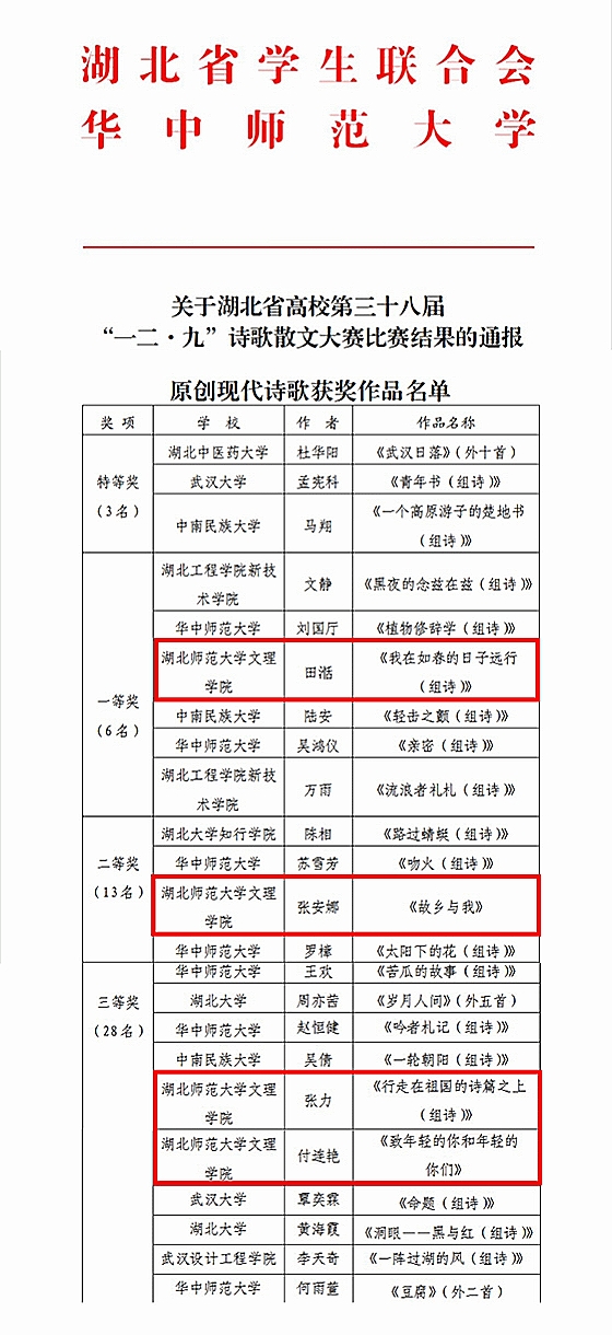 (通讯员:苏祎)2023年3月15日,湖北省学生联合会、华中师范大学联合举办的第三十八届“一二·九”诗歌散文大赛赛事结果已公布。Leyu Sports田湉荣获一等奖,张安娜荣获二等奖,张力、付连艳荣获三等奖。