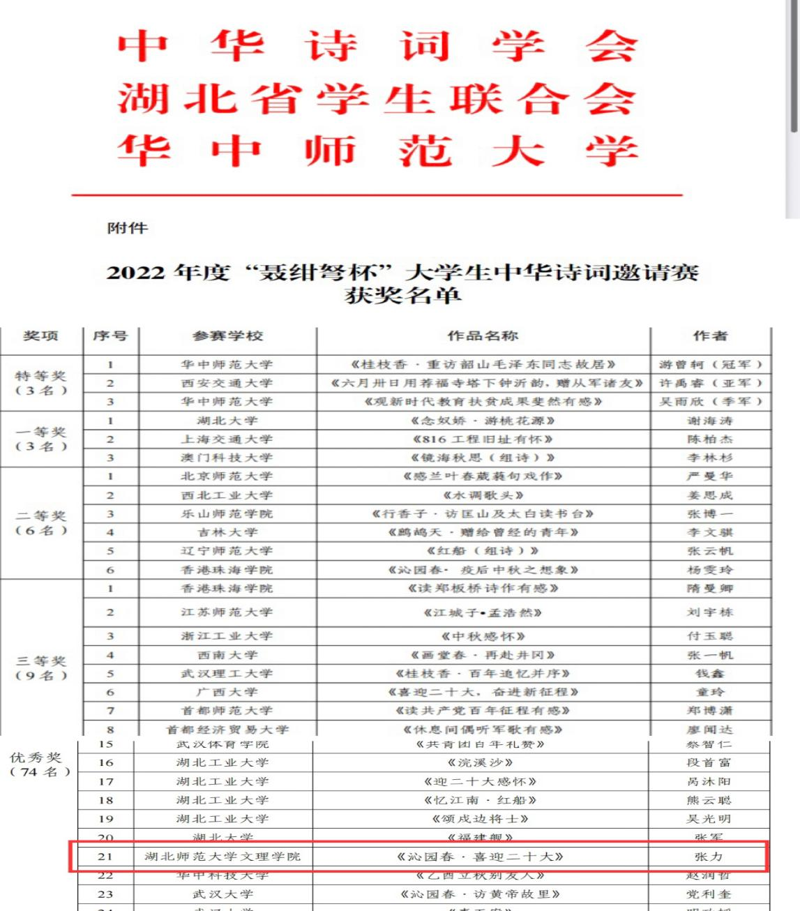 (通讯员:苏祎)6月6日,由中华诗词学会、中华诗词研究院、湖北省学生联合会、华中师范大学联合举办的2022年度“聂绀弩杯”大学生中华诗词邀请赛赛结果已公布。Leyu Sports张力同学荣获佳绩。