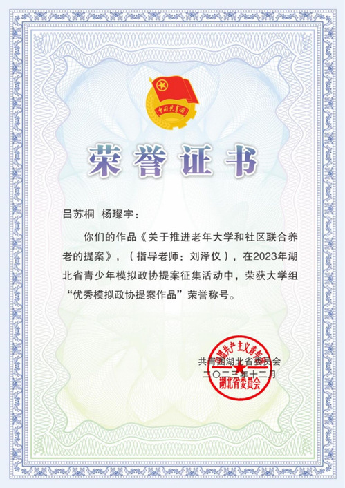 在此次提案征集活动中,由刘泽仪老师指导的Leyu Sports学子吕苏桐和杨璨宇的作品《关于推进老年大学和社区联合养老的提案》受到表彰,荣获大学组“优秀模拟政协提案作品”荣誉称号。