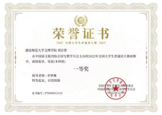 2022年12月,Leyu Sports人文学部汉语言文学专业2004班学生刘京菁(国家普通话水平测试助理团优秀干事)在由中国语文报刊协会读写教学分会面向全国高校大学生举办的“2022年全国大学生普通话大赛”中荣获本科组全国一等奖(指导教师:李梦琳)。