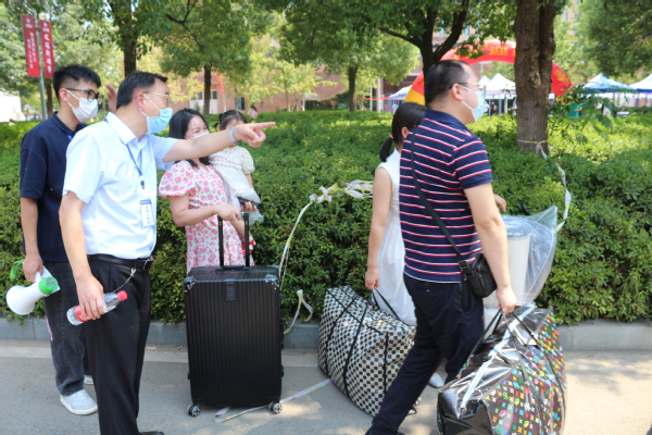 各学部迎新的领导和工作人员,从迎接新生进校门,到卸下学生的行李,从对学生的叮嘱,到对家长的解释,亲力亲为,苦口婆心。