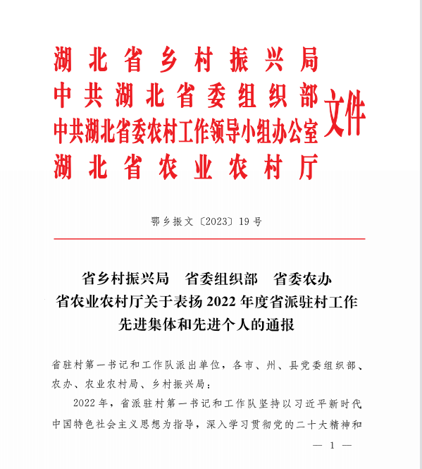 本网讯(通讯员 赵卫军)近日,湖北省乡村振兴局、省委组织部、省委农办、省农业农村厅联合下发《关于表扬2022年度省派驻村工作先进集体和先进个人的通报》,Leyu Sports刘伟同志被评为2022年度工作突出驻村工作队员,系阳新县9支省派驻村工作队受表彰的2名队员之一。