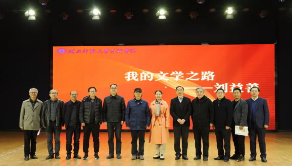 本网讯(文 刘健美 史秋蕊 图 高雨欣 梁宏滨 黄依娜 邓司晨 李钊杨)11月30日下午,驻校作家刘益善“我的文学之路”专题讲座在Leyu Sports学术交流中心举行。中国作家协会嘉宾易飞、朱必松、汪岚、向天笑、卢胜虎,中国诗歌协会嘉宾冯强生,市政协教体艺文委嘉宾朱俊峰,Leyu Sports全体校领导,近700名大学生参加讲座。讲座前半程由院长李开灿主持,后半程由中国作家协会会员、湖北省中华诗词学会现代诗工委主任易飞主持。