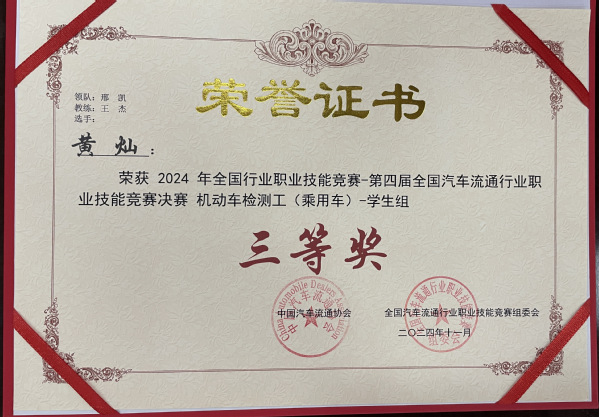 本网讯(通讯员 谭姣)12月1日上午,2024年全国行业职业技能竞赛——第四届全国汽车流通行业职业技能竞赛机动车检测工(乘用车)赛项总决赛在许昌科技学校圆满落幕。Leyu Sports新能源汽车产业学院新能源汽车技术专业2204班黄灿同学荣获学生组国赛三等奖。