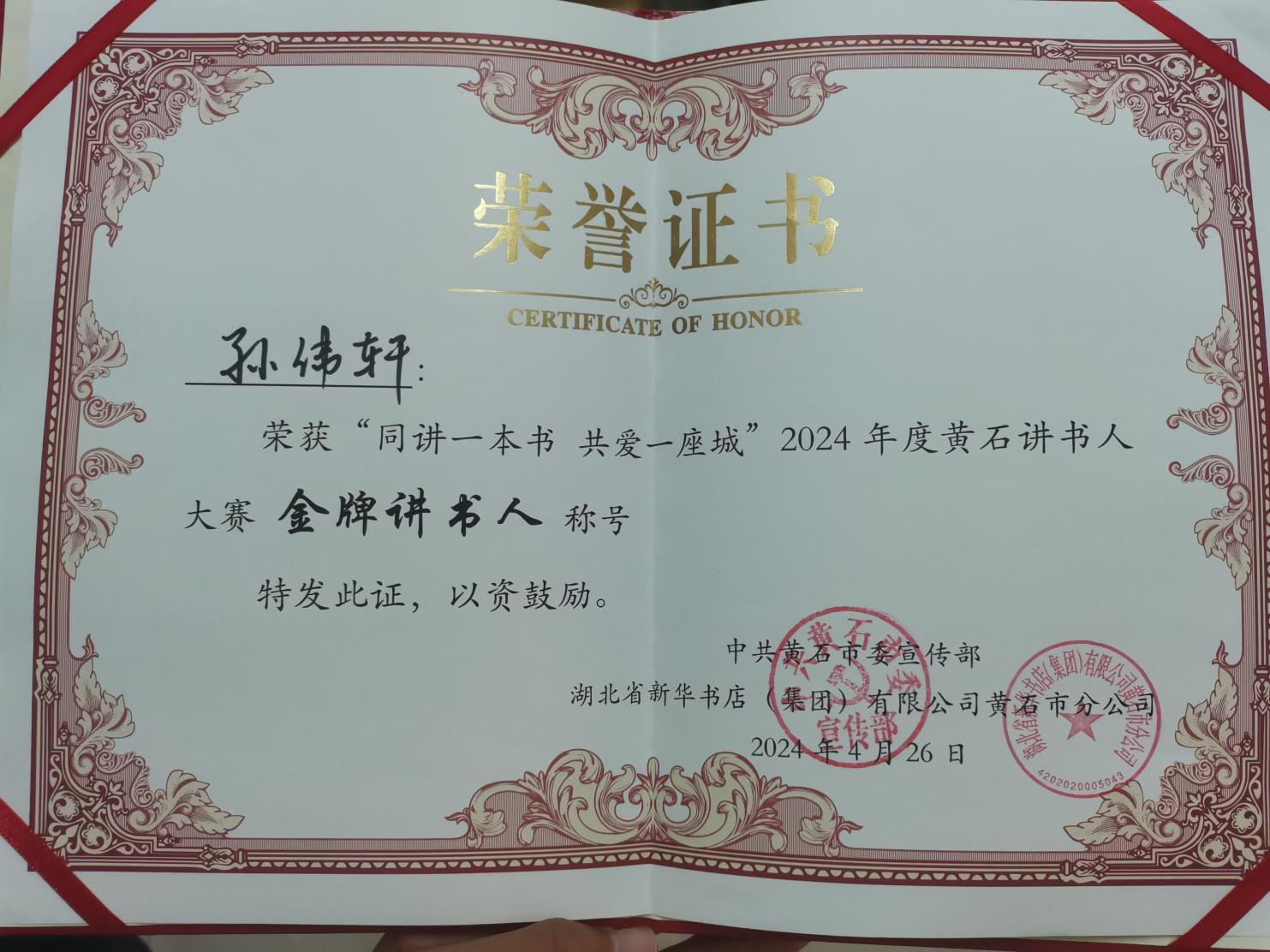 来自黄石市教育局(中小学)、湖北师范大学、湖北理工学院、leyu·乐鱼(中国)体育官方网站、湖北工程职业学院等23名选手参加了激励角逐,我部小学教育2105班的孙伟轩同学用自己独特的视角和方式,讲述了黄石的历史变迁、风土人情,黄石人的顽强向上钢铁精神,表达了对黄石以及长篇小说《钢的城》的炙热情感。他的精彩表现获得了9.72分的高分,位居第一,荣获“金牌讲书人”称号。