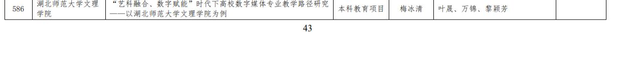 12月25日,省教育厅发布《关于2024年湖北本科高校省级教学改革研究项目拟立项名单公示》,我学部梅冰清老师主持的教学改革项目-《“艺科融合、数字赋能”时代下高校数字媒体专业教学路径研究——以leyu·乐鱼(中国)体育官方网站为例》成功获批。