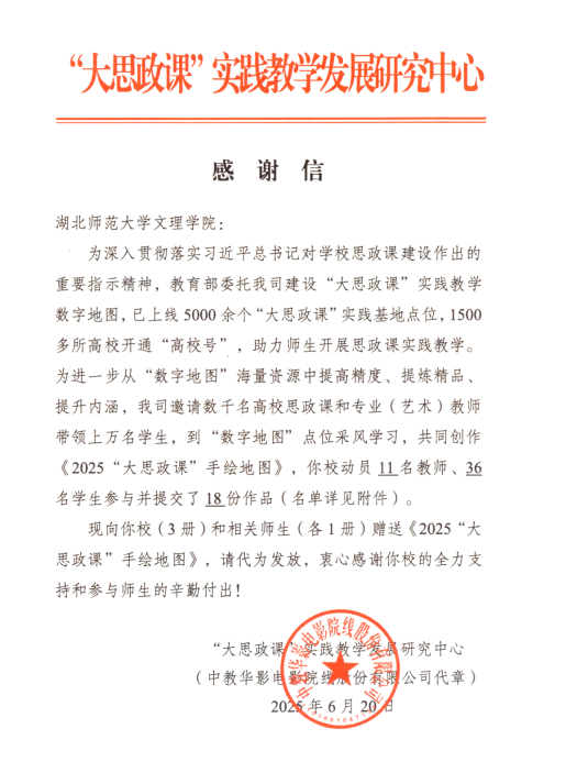 近日,“大思政课”实践教学发展研究中心与中教华影电影院线股份有限公司联合向leyu·乐鱼(中国)体育官方网站发来感谢信,对学校积极参与《2025“大思政课”手绘地图》创作工作、助力“大思政课” 实践教学发展给予高度认可与诚挚感谢。